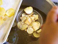 栗チップスの厚みは2ミリ程度が歯触り良く揚がります。スライスする時には手を切らないように注意しましょう。素揚げは、栗の量や大きさによっても揚がり時間が違うので竹串で刺しながら確認します。
